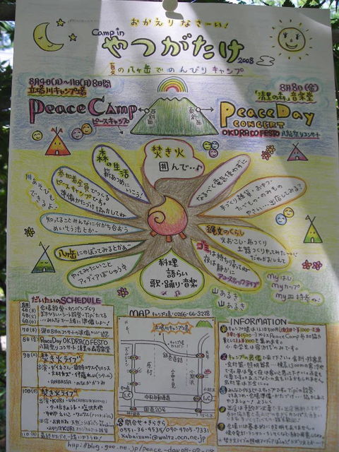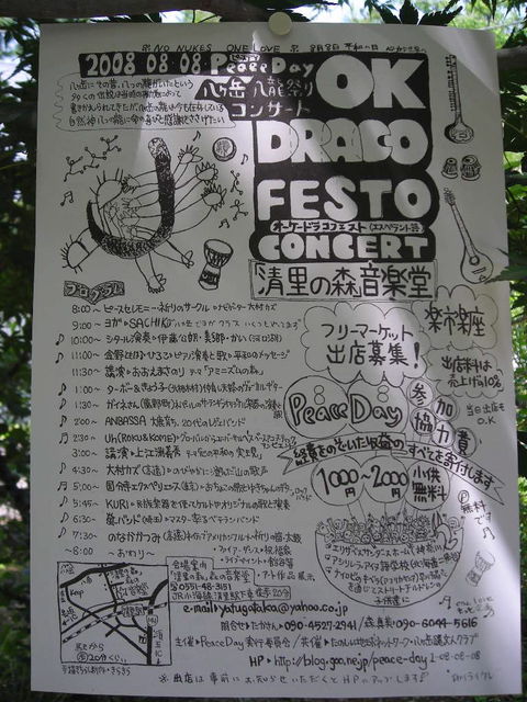 《ピースデイ》& 《ピースキャンプ》in八ヶ岳 ■ピースデイ2008/08/08■ ☆OK DRAKO FESTO☆ オーケ− ドラコ フェスト(エスペラント語) 八ヶ岳・八龍祭りコンサート 【メッセージ】 八ヶ岳にその昔八つの龍がいたという 多くの伝説は当時の権力者によって書きかえられてきたが 八ヶ岳の龍は今も存在している 自然神八つの龍にいのちの喜びと感謝を捧げたい 【場所】 「清里の森」音楽堂:山梨県北杜市清里町 http://www.kiyosatonomori.co.jp/facilities/ongakudou/index.html 【コンサートプログラム】 午前8時