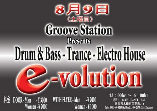 8月9日(土曜日)23:00〜6:00 Groove Station presents: e-volution 場所:Blue Dance Bar 当日:Boys \3000_Girls \2000 With Flyer:Boys \2000_Girls \1000 Flyer はここら印刷してもOKです