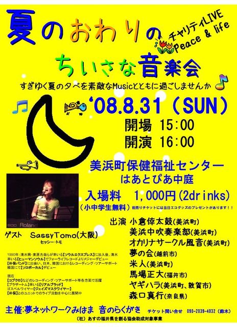 このたび、このmixiでのハンドルネームをPitakaから本来のSassy Tomo さんへ替えられた我らがTomoさんのソロライブのお知らせです。 今回は福井県美浜町でのイベント「夏のおわりのちいさな音楽会」へのゲスト出演でございます 場所:福井県三方郡美浜町郷市健康福祉センター 「はあとぴあ」中庭 時間 15:00〜 入場料:¥1000(2Drink) となっております 出演者ほか多数 福井県の皆様〜ならびに北陸の皆様方〜ご家族ご友人お誘いあわせの上お越しくださいませぇ〜〜〜 またイベントのアップ大変遅れましたことお詫びいたします 管理人失