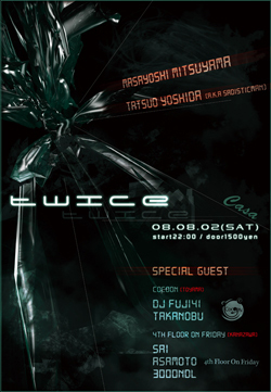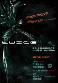 music: minimal techno TWICE 2008 8/2 SAT OPEN 22:00 DOOR 1500yen 常にアンダーグラウンドな空間を提供し続ける Casaのレギュラーパーティー 1-1=2 マイナスの美学を追究しつづける ミニマルテクノパーティー「twice」 ストイシズムで最小限な音の結晶と その反復が引きおこす最大限のエクスタシーで 己の潜在的覚醒と陶酔をも呼び起こす。 終わりなき無限回廊の果てにあるものとは・・・ 【 COCOON (富山)】 DJ FUJI41 TAKANOBU 【 4th Floor On Friday (石川)】 SAI (4th Floor O