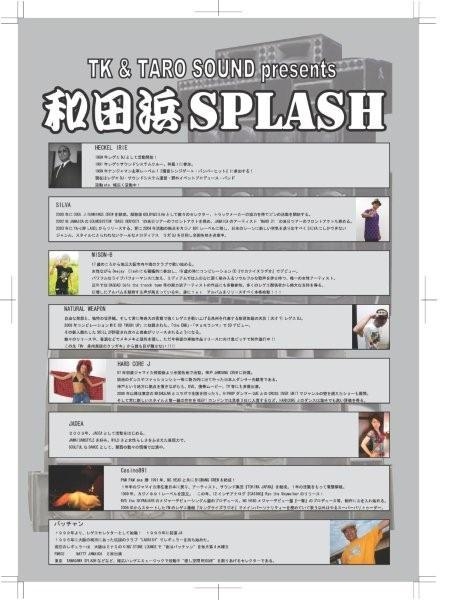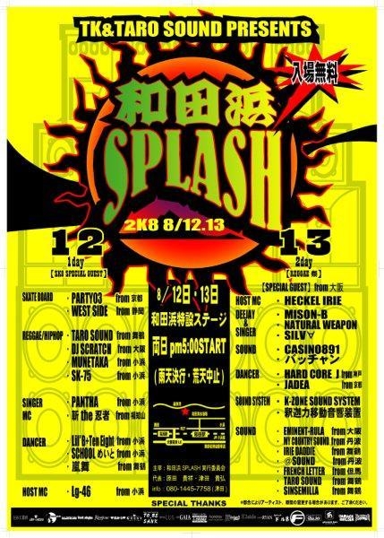 TK&TARO SOUND PRESENTS 和田浜〜splash〜 2008 〜SK8.REGGAE.HIP HOP DANCE Carnival〜 2008年8月12日13日 (二日間) 雨天決行(荒天中止) @和田浜海水浴場 特設ステージ(7番辺り) 福井県大飯郡高浜町和田2-13-13 交通手段 舞鶴若狭自動車道大飯高浜I.Cを降りた後、高浜方面へ。 スムーズに走行した場合、約7分。 和田駅(交差点名)を左折後、突き当りを左折。 下道の場合 27号線を小浜方面に走り、和田駅の交差点を左折。突き当たりが和田浜。 電車の場合 JR小浜線 若狭和田駅下車、徒歩約10分。