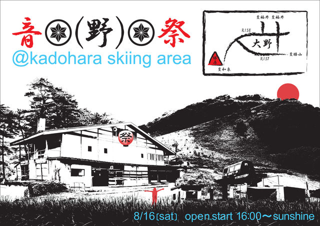 音(野)祭 @Kadohara sking area 8月16日 (土) OPEN START: 16 : 00〜SUNRISE(雨天中止) 福井県大野市 勝原スキー場 ENTRANCE FEE: 当日1000円 GUEST:フェンサー (Suburban) もにゅぴた(NEO☆PHYTE RECORDS) DJ,s: DIVE?、 DJだぜ(東京ラブストーリー)俺、 DJテトラポット、 DJSham、 等 物販ブース ドリンク&フード(鉄板焼き、豚汁)等 、格安で提供!! 「わんこそば!早食いチャレンジ!!」開催!! ダンスショーケースあり!! 浴衣で来場の女の子 男の子にはステキな