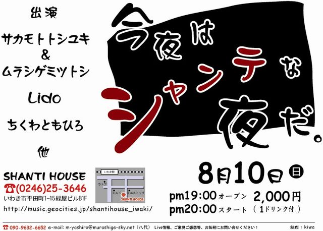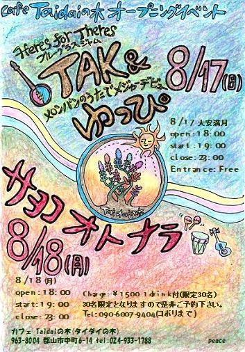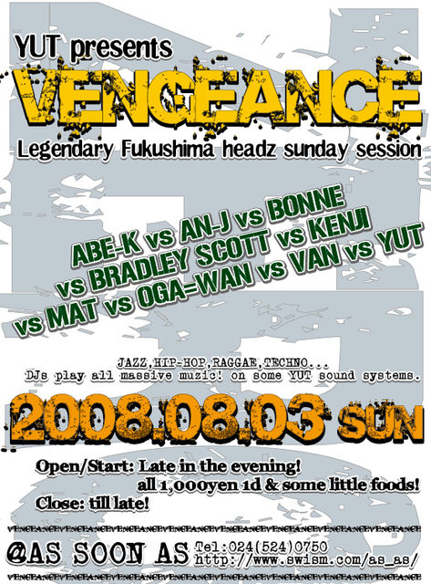あのYUTが8月3日(日)に"VENGEANCE"を開催!! 通常のパーティでは考えられないメンバーが勢ぞろい! 3日の予定は空けておきましょう! YUT presents "VENGEANCE" Legendary Fukushima headz sunday session DJs: ABE-K vs AN-J vs BONNE vs BRADLEY SCOTT vs KENJI vs MAT vs OGA=WAN vs VAN vs YUT JAZZ,HIP-HOP,RAGGAE,TECHNO... DJs play all massive muzic ! on some YUT sound systems. 2008/08/03 (SUN) @AS SOON AS open/start Late in the evening ! 〜 till late ! all 1000yen 1d & some little foods