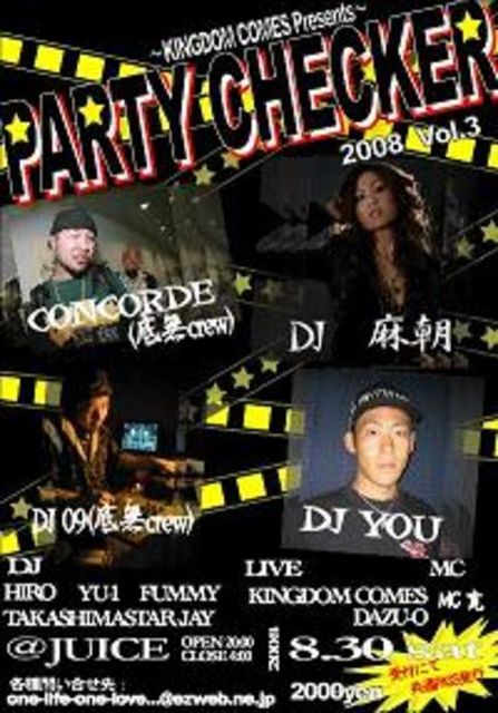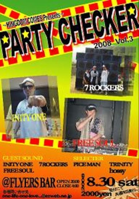 夏の終わり。。。 いやむしろ始まり ってなノリで行います今回のP.C P.C初の2会場開催です 詳細です ---------------------- ○PARTY CHECKER〇 2008.8.30(sat) 20:00〜 4:00 HH/R&B/REGGAE/HOUSE/ ROCK/ALL MUSIC \2500(1d) HIPHOP SIDE @JUICE REGGAE SIDE @FLYERS BAR 受付にて共通PASS配布。 HIP HOP SIDE @JUICE 〇GUEST DJ〇 DJ 麻朝 (TOKYO) DJ 09 (底無crew /YOKOHAMA) DJ YOU (TOKYO) 〇GUEST LIVE〇 CONCO