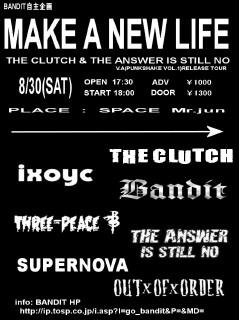 BANDIT初の自主企画発動 「MAKE A NEW LIFE vol.1」 -THE CLUTCH&THE ANSWER IS STILL NO V.A「PUNK SHAKE vol.1」Release Tour- @出演バンド(順番不順) †THE CLUTCH(名古屋) †THE ANSWER IS STILL NO(名古屋) †THREE-PEACE †SUPERNOVA †IXOYC †OUT OF ORDER †BANDIT @DAY:8/30(SAT) @PLACE:SPACE mr.jun @OPEN/START:17:30/18:00 @ADV/DOOR:\1000/\1300(1D.\500別) 初の企画になんと名古屋からTHE CLUTCHとTHE ANSWER IS STILL NOが参戦決定 地元からはBANDIT含め5バンド、合計7バン