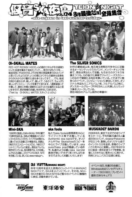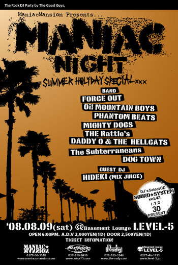 8月開催のMANIAC NIGHTは「Summer Holiday Special」と題し、ManiacMansion Crewに精通する地元バンドが多数出演!オープン時間が6:00PM.となっていますのでご注意下さい。