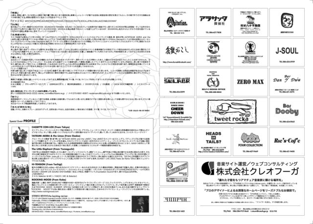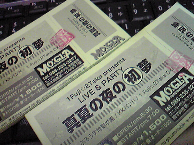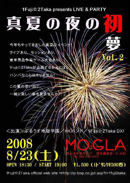 1Fuji☆2Taka企画ライブ&パーティー 【真夏の夜の初夢 Vol.2】 場所: MO:GLA 岡山市中央町3-17 橋本興産第一ビル 地下1階 086-235-3277 時間: 開場18:30 開演19:00 料金: \1,500 出演: ・ぶるうす地獄学園 ・KKバンド ・1Fuji☆2Taka ※今年も開催決定! 昨年以上に楽しめる企画を検討中です。 ご期待ください。