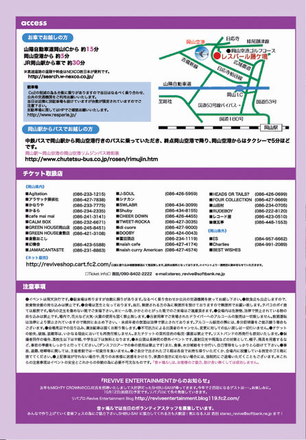 管理人様、告知させてください。 08/08/10(日) 『タイトル』:音ヶ鳴ル!-南国音泉 NANGOKU ONSEN- 『場所』:レスパール藤ケ鳴(〒701-1141 岡山市菅野3399-1 TEL 086-294-1717 FAX 086-294-3200) http://www.resparle.jp/ (HP内イベント情報発信中) 『時間』:11:00-21:00 『料金』:ADV:3,500ADM:4.500(1ドリンク、入浴券付き) 宿泊プラン:4名(1人9,500)3名(1人10,200)2名(1人13,500) ※チケット込みの値段になります(入浴、ワンドリンク、翌日の朝食付き) お盆時期なのでお早めにご予約ください。詳しくはHPで。http://