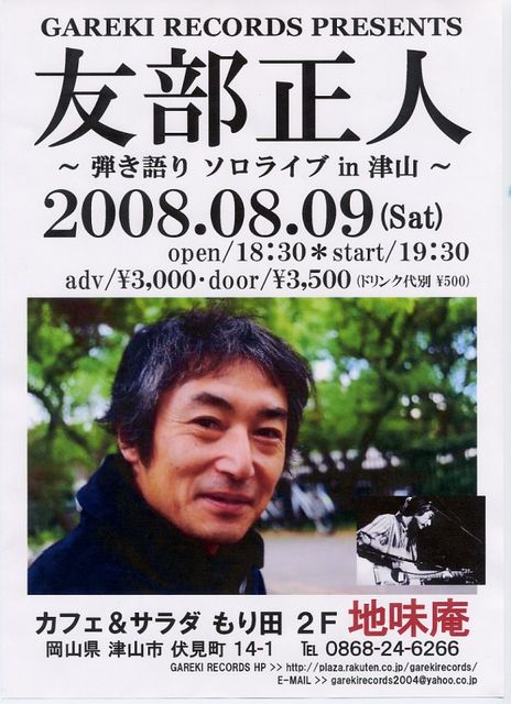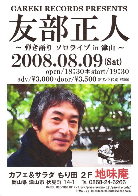 ガレキプレゼンツ・夏休みスペシャル!! 友部正人が岡山県津山市にやってきます! GAREKIRECORDS PRESENTS 友部正人 〜弾き語り ソロライブ in 津山〜 2008.08.09(Sat) open 18:30 start 19:30 adv \3,000 door \3,500 (ドリンク代別\500) カフェ&サラダ もり田2F 地味庵 70名様限定ライブ。 チケットの申し込みは チケット専用E-MAIL↓ garekirecords2004@yahoo.co.jp または ガレキHPの『Mail』→『メッセージを送る』にて申込み承っております。 http://plaza.rakuten.co.jp/garekirecords/