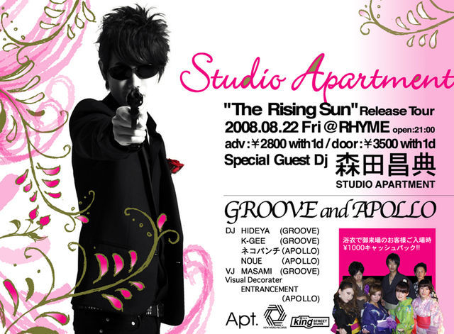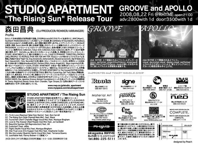 ■8/22(金) 21:00 START ■STUDIO APARTMENT“The Rising Sun”Release Party 「GROOVE×APOLLO」 ■SPECIAL GUEST DJ ・森田昌典(STUDIO APARTMENT) http://mixi.jp/view_community.pl?id=28401 ■DJ ・HIDEYA(GROOVE) ・K-GEE(GROOVE) ・ネコパンチ(APOLLO) ・noue(APOLLO) ■VJ ・MASAMI(GROOVE) ■Visual Decorater ・ENTRANCEMENT ■会場 @RHYME(ライム) 〒700-0901 岡山市本町10-16 YUKITAKE BLD,4F TEL&FAX: 086-225-5111 http://mixi.jp/view_community.pl?id=332270 ■