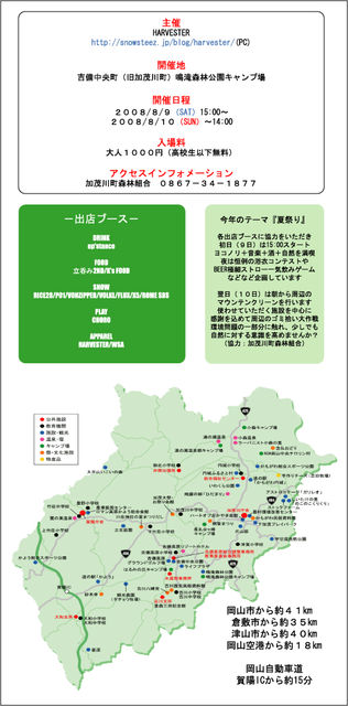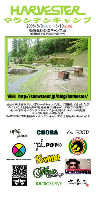 毎年恒例の『HARVESTERビーチキャンプ』 今年はなんと!キャンプ場を借り切る事に成功しました♪ そして場所はいつもの鳥取ではなく岡山の山の上、鳴滝森林公園キャンプ場。 (予定) ★PA機材を用いてのサウンド ★飲食ブースの設置 ★ゲーム(夏恒例の浴衣コンテスト等) ★メーカー展示会 ★環境問題への取り組みの一環として募金活動(関係団体への寄付) ★施設周辺のマウンテンクリー 現在出店予定ブース HARVESTER、WSA、UP STANCE、立呑み2ND、K's FOOD、CHORA SNOWメーカー展示ブース(RICE28、P01、VOLKL、FLUX、ROM