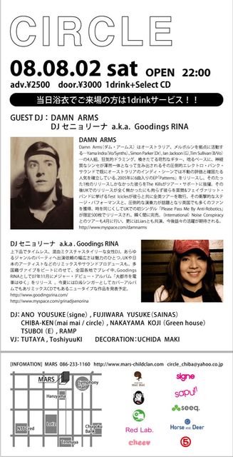 皆様!!この日岡山は花火大会!!の後はぜひMARSに遊びに来てください!! 浴衣の方には特典付きですよ♪ 今回デコレーションに書道アーティストの方も加わり和をイメージした空間を作ります! 映像、書道、音で1つのCIRCLEを・・・ ー CIRCLE ー 08.8.2(sat) @ MARS okayama open / 22:00〜 adv.2500円 door.3000円 共に1drink+Select CD付き *当日浴衣でご来場の方は1drinkサービス!! GUEST DJ : DAMN ARMS DJ セニョリーナ a.k.a. Goodings RINA DJ: AN