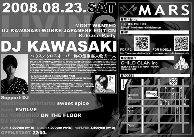 管理人様告知失礼します。 ハウス/クロスオーバー界のブライテスト・ホープ。 DJ KAWASAKIが約半年ぶりに来岡!!!!! *LIVING 『MOST WANTED DJ KAWASAKI WORKS JAPANESE EDITION Release Party』 *GUEST DJ KAWASAKI HP : http://columbia.jp/artist-info/djkawasaki/ mixi : http://mixi.jp/view_community.pl?id=329326 *2008.8.23(SAT) OPEN/START 22:00!! @okayama MARS HP : http://www.mars-childclan.com/ mixi : http://mixi.jp/view_community.pl?id=18854