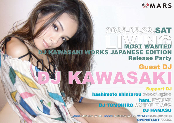 ■タイトル:DJ KAWASAKI WORKS JAPANESE EDITION RELEASE PARTY ■日程:2008年 8月 23日(土) ■OPEN : 21:00 〜 ■場所:OKAYAMA MARS http://mixi.jp/view_community.pl?id=1885462 ■料金:前売 3,000円/当日 4,000円/WF 3,500円 ※共にドリンク代別途必要 ■GUEST : DJ KAWASAKI ■DJ : hashimoto shintaro / ham / TOMOHIRO / HAMAS ■問合せ先:MARS 086-233-1160 ■DJ KAWASAKI ハウス/クロスオーバー界の最重要人物の一人。 '05年に「BLAZIN’」でKING STR