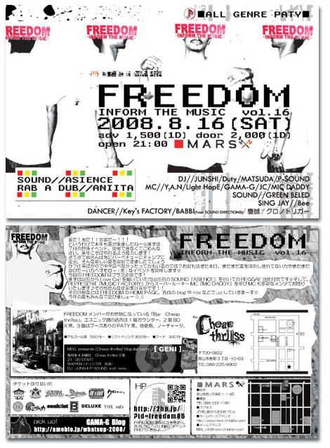 皆様こんにちわ。 涙がとまらんjeloです。 アレルギー。。。。 はい。 気分屋更新FREEDOM情報ですwww。 次回FREEDOM PARTYはこちら! ----------------------------- FREEDOM -INFORM THE MUSIC-vol.16 ----------------------------- 2008/8/16(SAT) ■MARS OPEN 21:00- ADV1,500YEN / DOOR 2,000YEN (ともに1D付き) DJ//JUNSHI/Duty/MATSUDA/P-SOUND MC//Y.A.N/Light HopE/GAMA-G/JC/MIC DADDY SOUND//GREEN BELED SING JAY//Bee DANCER//Key's FACTORY/BABBI(from SOUND DIRECTIONS)/慶誠/クロノトリガー