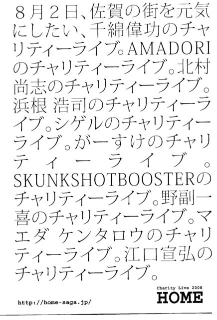“佐賀ん街ば元気にしたかなぁ” それが全てのはじまりです。 音楽を通してきっかけが作れないか! 今の自分たちに出来ることは何か! そんな想いから、このイベントは生まれました。 千綿偉功 チャリティーライブ2008『HOME』〜誰もが笑顔になれる場所〜 “世界の子供たちにワクチンを送ろう” ◇日 時:2008年8月2日(土) 正午12時 開始(予定) 〜 午後6時45分(予定) <当日のタイムスケジュールにより開始及び終了時間が多少前後する場合があります> ◇会 場:佐嘉神社内特設ステージ ※入場は無料です。