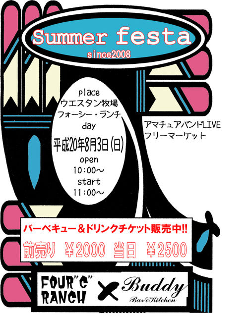 皆さ〜〜〜ん ご無沙汰してます♪( ´∀`∩ 花見パーティー以来の大型イベントがいよいよ開催!! ヽ( ゚∀゚)ノ 今回は 佐志にある 4Cランチさんと Buddyさんのコラボ企画!!! 題して!! 「Summer Festa 2008!!」 イベント内容はというと!! 総勢七組の アマチュアバンドLIVE!! & フリ−マーケット!! & バーベキュー!! 開催日は!! 2008年8月3日(日) 10:00〜 OPEN!! 11:00〜 LIVE START!! 〜18:00 END バーベキ