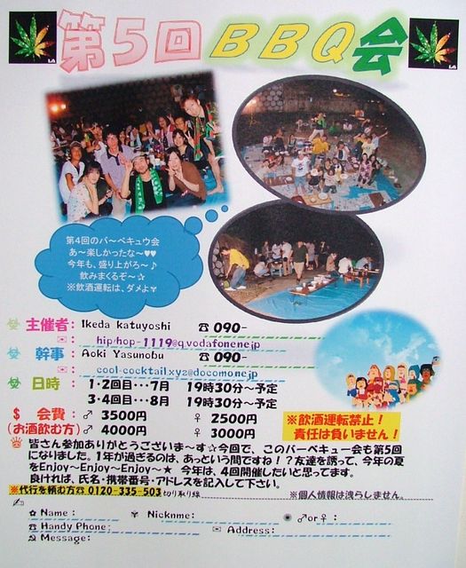 第五回バーベキュー会(第三部)開催のお知らせ 第二部は、台風・雨の為BBQ中止して居酒屋で飲み食べしました〜 参加してくださった方ありがとう〜ございました 15日は、台風も雨も降らないように祈っとかないと〜ワラ 今年も待ちに待った〜第三部のBBQ会を開催しま〜す 第四回(去年)は二回に分けて催したにも拘わらず、よそう以上の人数にビックリ幹事てんてこまい嬉しくも最後まで皆さんとゆっくり絡むことが出来ませんでした なので今年は、第1部〜3部まで開催しようと思ってま