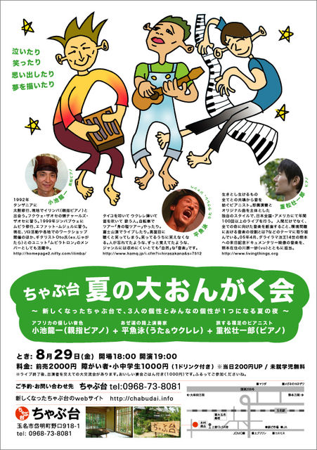 今年で5度目となる、恒例の夏のツアーを行います。 それぞれいろんな企画でお楽しみいただけます。 みなさま、ぜひともお越し下さい! ━━━━━━━━━━━━━━━━━━━━━━━━━━━━━━━━ ★重松壮一郎 夏の全国ツアー「夏旅2008」 http://www.livingthings.org/08summer .................................................................................................................. 8/02(土) ギャラリー花伝(佐賀・有田) 8/08(金) カフェスローOSAKA(大阪・十三) 8/10(日)