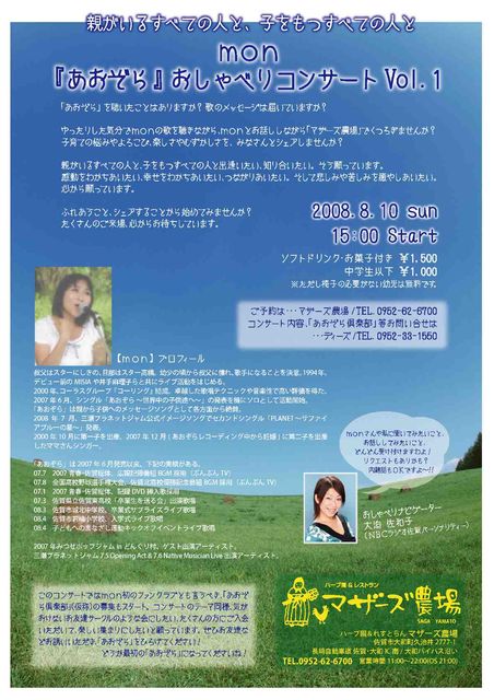 子育て関連?かなと思うイベントなんですが、monと言うママさんシンガーの企画モノコンサートです。 おしゃべりナビゲーターにNBCラジオ佐賀の美人?パーソナリティー、大迫佐和子さんをお迎えし、あること無いこと?お話ししながら歌も聴ける、また、monや大迫佐和子さんの裏話やらも聞けて、お話しできる、と言う感じの企画です。 「親がいるすべての人と、子をもつすべての人と」と言うサブタイトルで、「そんなん、みんなあてはまるやないかい!」と言うツッコミは聞かないフリで、子育てや教育、はたまた「いのち」についてなどを、あんまり高