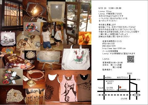 Lamp.が雑貨屋になる日 手づくりの作品ばかりです。 一つしかない自分のお気に入りを見つけに来て下さい。 参加者も募集します。 絵を描いてる、手作りで何かを作っているなど 自分の作品をお客さんに見てもらいたい方、 中庭のある民家を改装したゆっくりとした空間で 一緒に楽しい時間を過ごしましょう。 詳細はお気軽に問い合わせ下さい。 佐賀市神野西3-1-25 0952-20-2133 090-2853-7299 http://www.lamp-1810.com (http://map.yahoo.co.jp/pl?p=%BA%B4%B2%EC%B8%A9%BA%B4%B2%EC%BB%D4%BF%C0%CC%EE%C0%BE3%C3%FA%CC%DC12-25&