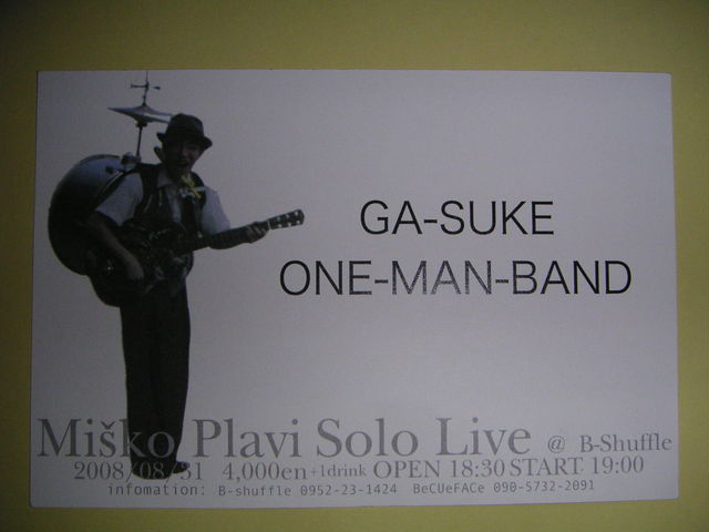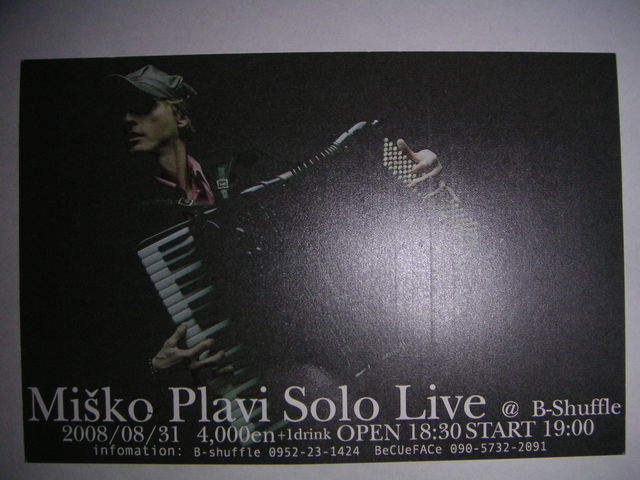 久々に佐賀 B-Shuffle にてライブです。 ヨーロッパ屈指の天才アコーディオンプレイヤー Misko Plavi 氏のライブに出演させてもらいます。 久々のワンマンバンドでの出演です。 2008/08/31 4000en+1drink OPEN 18:30 START 19:00 セルビアの気分を味合う滅多にないチャンスですよ。 たくさんの人に来てほしいな。 P.S 前座、中座の出演でアコギでの演奏もやります。 ●Misko Plavi(ミシュコプラヴィ) ヨーロッパ屈指の天才アコーディオンプレイヤーにして 作曲家であり、マルチ演奏家としても有名な