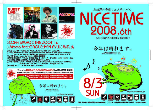 いよいよ今週末に迫りました。 今年は晴れそうです。 HP:http://nicetime.sub.jp/ イベント名:NICE TIME 2008 (6th)鳥栖野外音楽フェスティバル 日時:2008年8月3日(日曜日)12:00〜21:00 場所:河内ダム多目的広場特設野外ステージ(佐賀県鳥栖市河内町) アクセス:JR鳥栖駅=会場間臨時バス運行 チケット:前売り¥3000- (中学生以下入場無料) Lコード:84882 電話予約 0570−084−008(Lコード84882) ローソンインフォメーション 0570−000−777 MC:AO&LUE