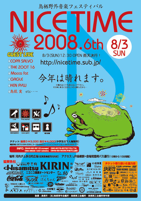 イベント名:NICE TIME 2008 (6th)鳥栖野外音楽フェスティバル 日時:2008年8月3日(日曜日)12:00〜21:00 場所:河内ダム多目的広場特設野外ステージ(佐賀県鳥栖市河内町) アクセス:JR鳥栖駅=会場間臨時バス運行 チケット:前売り¥3000- (中学生以下入場無料) Lコード:84882 電話予約 0570−084−008(Lコード84882) ローソンインフォメーション 0570−000−777 MC:AO&LUE [GUEST LIVE!!!] COPA SALVO http://www.copasalvo.com/index.php THE ZOOT 16