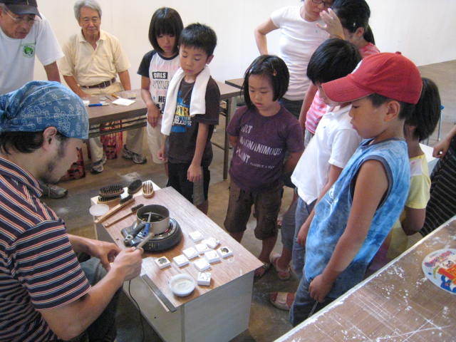 「メダルワークショップ」 去年も開催した金属のメダルを作ろうワークショップ。 ピューターメタルを使って自分だけのメダルを作ろう。 【メダルの作り方】 1.石膏のブロックに自分の作りたい形を描く。(左右対称なので注意) 2.形をなぞるように石膏を彫り、金属を流し込む型を作る。 3.2に金属を流す。 4.固まったら型から取り出して磨く。 5.ピカピカになったらメダルの完成。 8月17日(日) 13:00〜15:00 ○料金:2000円