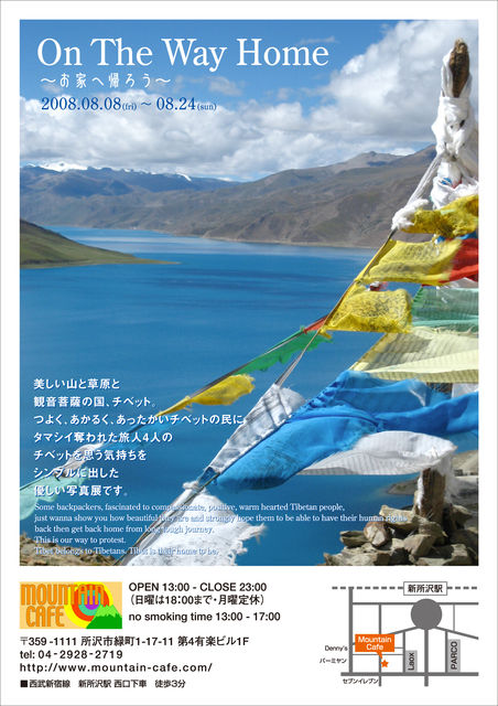 とにかくチベットが好き! チベット人の笑顔にメロメロ! というバックパッカー達が、お気に入りのショットを 披露します〜。 ”On The Way Home 〜お家へ帰ろう〜” 開催期間:8月8日〜24日 / 月曜定休13:00〜23:00(日曜18:00まで) 場所 :新所沢・マウンテンカフェ http://geocities.yahoo.co.jp/gl/yeitaro 埼玉県所沢市緑町1-17-11-1F Tel/04-2928-2719 会場となるオーガニックカフェのオーナーももちろん 現役バックパッカー!新婚旅行でチベットに行った、という おもろいオッ
