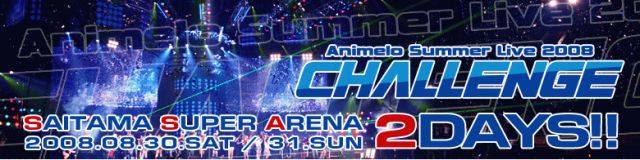 Animelo Summer Live 2008 -Challenge- オフィシャルサイト http://animelo.jp/challenge/ 【日時】 2008年8月31日(日) 14:30開場 16:00開演 【会場】 さいたまスーパーアリーナ 埼玉県さいたま市中央区新都心8番地 JR東北本線(宇都宮線)・高崎線・京浜東北線 「さいたま新都心」駅下車 徒歩すぐ または JR埼京線「北与野」駅下車 徒歩7分 http://www.saitama-arena.co.jp/(PC) 【料金】 全席指定/前売 \7,500(税込) 【出演アーティスト】 8月31日(日)石川智晶/黒薔薇保存会/サイキックラバー/JAM Project(影