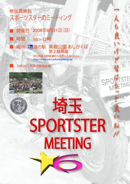 毎度お世話になっています。 今年も小さいながらも埼玉SportsterMeetingを開催させて頂きます。 お陰様で第6回目を迎える事ができました。 参加者始め応援していただいた皆さんありがとうございます。 今回も是非ふるってご参加をお待ちしています。 詳細・・・ 場所 道の駅『果樹公園あしがくぼ』 第二駐車場 (オーバーフロー時には第一へお回りいただく場合もございます。) 日時 2008年8月31日 10時〜12時各自解散。 参加費 無料 少雨決行とさせて頂き
