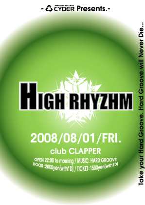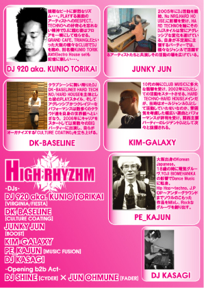 収し、今主流のMINIMAL/TECH HOUSEをも凌駕する新型TECHNO SOUND=【HARD GROOVE】に焦点を当てて誕生するNEW PARTY【HIGH RHYZHM】。