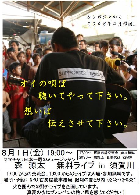 8月1日(金)森源太 野外ライブ http://hyakushouyashiki.web.fc2.com/ 17:00〜 百笑屋敷交流会 参加無料! 18:45〜 銀河のほとりからライブ会場へ移動開始 19:00〜 ライブ 参加無料!! 20:30〜 懇親会 食事つき 2,500円 詳細はイベント掲示版で。 交流会では、自由に出展、出展できます♪お互いの活動、情報交換などのびのびとお楽しみ下さい。
