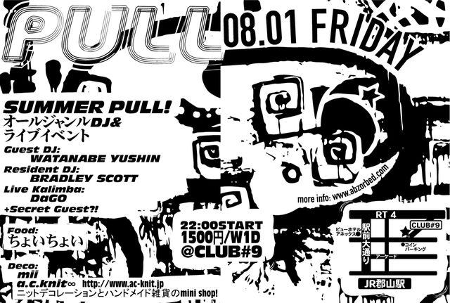 SUMMER PULL! http://abzorbed.com 08.01 FRI22:00START 1500円/W1D @CLUB#9 http://sharp-9.com with Guest DJ: WATANABE Yushin (shin-kai) Resident DJ: BRADLEY SCOTT (pull, breakup, independant) Live Kalimba: DaGO +Secret Guest?! FOOD: ちょいちょい Organic Cafe DECORATION and SHOP: Mii + a.c.knit∞ http://www.ac-knit.jp ニットデコレーションとハンドメイド雑貨のmini shop!