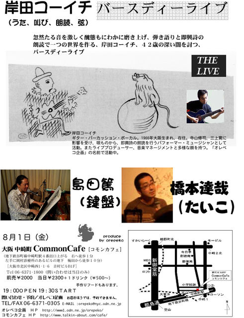 8月1日(金) 岸田コーイチ(うた・朗読・ギター) バースデイライブ 島田篤(ピアノ)橋本達哉(ドラムス) 忽然たる音を激しく醜態もにわかに磨き上げ、弾き語りと即興詩の朗読で一つの世界を作る、岸田コーイチ、42歳の深い闇を討つ、バースディーライブ 大阪 中崎町 CommonCafe[コモンカフェ] [大阪市北区中崎西1-1-6 吉村ビルB1F] (地下鉄谷町線中崎町駅4番出口上がる徒歩1分、梅田から徒歩10分) Tel 06-6371-1800 19:00OPEN 19:30START  前売¥2000 当日¥2300+1ドリンク ※手
