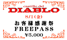 8/1(金)2(土)は… DIABLO お客様感謝祭!! なんと事前に前売りチケット\5,000を購入すると、当日『SET FREE』で楽しめます! 是非ご来店下さい!