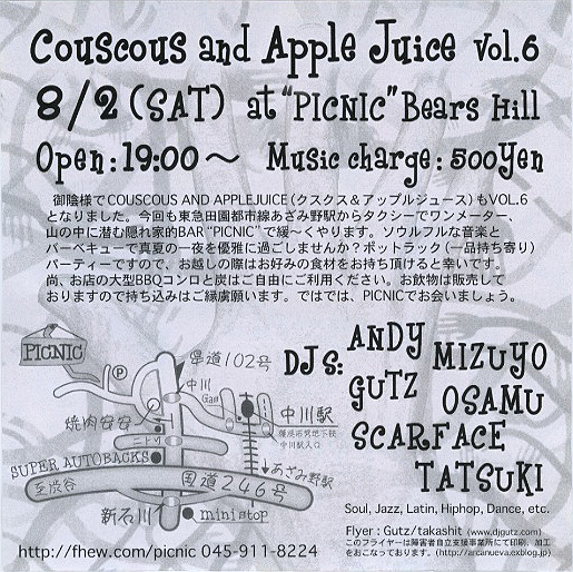 おかげさまでCOUSCOUS AND APPLEJUICE (クスクス & アップルジュース)もVOL. 6となりました。 ソウルフルな音楽とバーベキューで真夏の一夜を優雅に過ごしませんか? Date: 2008.8.2 Sat. Music Charge: \500 (Potrack形式のため何か一品Foodを持ってきてね。) BBQの火は起こしておきます。 混雑が予想されますのでなるべく車以外でヨロシクです。 Open: いつも通り 19:00〜 Ask: picnic 045-911-8224