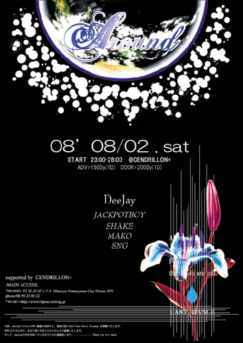 *** Around *** "LAST DANCE" 08・02(SAT) OPEN>>24:00〜28:00 @CENDRILLON+ DJ's JACKPOTBOY.MAKO.SHAKE.SNG ADV 1500(1D) DOOR 2000(1D) --------------------------------------------------- 今回、CENDRILLON+のSNGさん立案によりOne Night Party [Around]を開催します。このパーティーはジャンルは違えど各方面で活躍しているDJを召集し、「音」というキーワードの繋がりを確かめるべく行われるパーティーです!! そして今回、Analogの閉店に伴いFinal Partyとしてもリンクさせて頂いております。今まで店に