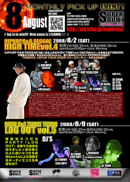 8月2日 HIGH TIMEvol.4 前売り 1500円 2DRINKs 当日 2000円 2DRINKs HIPHOP R&B REGGAEで熱く燃え上がるHIGH TIME! vol.4はCDのリリースを控えるTOMOROが関東から参戦! 松山からeNcbeatsも参戦! 更に高知のリリシスト ANSWERも参加!! TOMORO JAPAN TOUR 2008 リリースハ゜ーティー 8月2日開催!!! LIVE TOMORO [YOKOHAMA Y.T.F.CREW] SYU [YOKOHAMA Y.T.F.CREW] 根 [NIIHAMA D.U.P] ラップスケリオン [NIIHAMA D.U.P] eNcbeats[MATSUYAMA] ANSWER [KOUTI] FLAVOR [NIIHAMA] HOPE [NIIHAMA