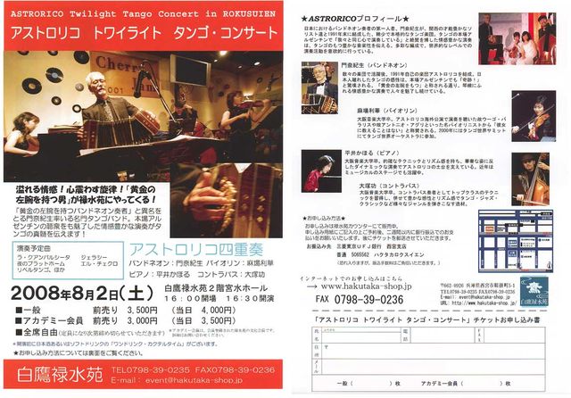 ASTRORICO Twilight Tango Concert in ROKUSUIEN ■ 出 演 : アストロリコ四重奏 ■ 会 場 : 白鷹禄水苑 宮水ホール http://www.hakutaka-shop.jp/access/index.html ■ 時 間 : 16:00 開場/16:30 開演 ■ 入場料 : 前売券/3,500円 (アカデミー会員 3,000円) 当日券/4,000円 (アカデミー会員 3,500円) *開演前に日本酒もしくはソフトドリンクのワンドリンク・カクテルタイム有り。 *全席自由(定員になり次第締め切り) ■ 予約・問い合わせ先 : 白鷹 http://www.hakutak