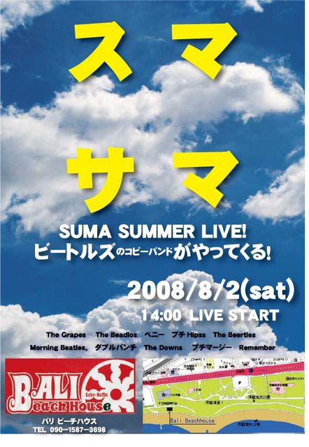 去年初めてやって好評をいただきましたスマサマ(須磨サマーライブ) 今年もやります! 題して「スマサマ2008!!」 日程だけ速報しておきましたが、概要が決まりましたので あらためてお知らせします。 ビーコピメンバーに限らず、ご家族、友人どなたでも参加できますので たくさんの参加をお待ちしております。 参加表明はこちらのイベントにコメントいただくか スタッフゥ〜〜!(レノンpapaさん・はっしさん・あや2・Taizo)までご連絡下さい。 日時 2008年8月2日(土) 12時〜バーベキュー