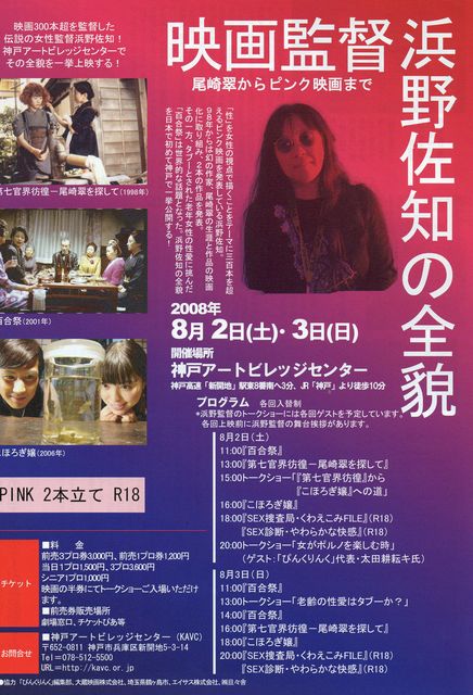 ★「映画監督 浜野佐知の全貌」 ★日時:8月2日(土)〜3日(日) ★場所:神戸アートビレッジセンター ★料金:前売3プロ券3000円/1プロ券1200円 当日1プロ券1500円/3プロ券3600円/シニア1000円 ★8月2日(土)※各回入れ替え制 11:00「百合祭」 13:00「第七官界彷徨—尾崎翠を探して」 ※15:00〜トークショー「『第七官界彷徨』から『こほろぎ嬢』への道」 16:00「こほろぎ嬢」 18:00「SEX捜査局/くわえこみFILE」「SEX診断/やわらかな快感」(R18) ※20:00〜トークショー「女が