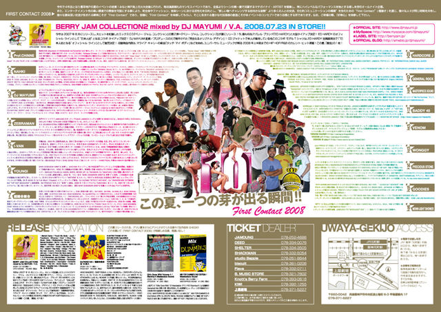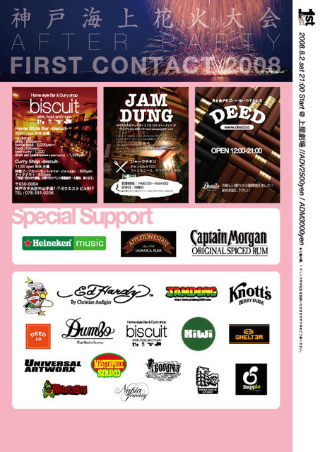 First Contact2K8 ―神戸海上花火大会after PARTY― <この夏一つの芽が出る瞬間> 今年で4年目となり最早神戸の夏のイベントの定番! みなと神戸海上花火大会後に行われ、今年は多数のリクエストにお答えしまして、花火会場の入り口右側にある上屋劇場での開催です。 全国よりシーンの第一線で活躍するマチガイナイ・ARTISTを徴集し、常にハイレベルなパフォーマンスを始とする催しを含むオールナイト企画。 エンターテイメント性の高い環境での開催を可能にする事により、町全体やファッション、音楽シーンにおける活性化を目的と