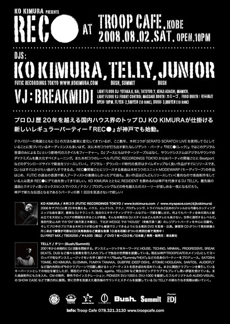 プロDJ歴20年を越える国内ハウス界のトップDJ KO KIMURAが仕掛ける新しいレギュラーパーティー『REC●』が神戸でも始動! KO KIMURAとともにRESIDENTを務めるのは神戸を代表するDJ TELLY。最先端の選曲とクオリティ高いミックスセンスでハウス/テクノ/プログレッシヴなどの枠を越えたのストーリーが楽しめる一夜になるだろう。神戸で新たな伝説となるであろうパーティの第1回目を見逃さないで欲しい! http://troopcafe.iflyer.jp/venue/flyer/28006 「KO KIMURA presents REC●」 2008年8月2日(土曜日) / 22:00-LATE @TroopCafe_k