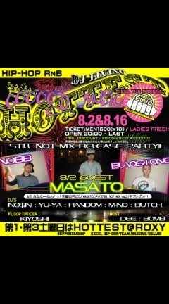 告知失礼します 『HOTTEST』 ■8月は、 『SUMMER TIME+1SPECIAL』 ◇◆第1土曜 2日は、 『STILL NOT MIX』 をリリースしたばかりのDJ MASATOをGUESTに招いてお送りします!!! しかもっ!!! 今回はなんとっ!!! 先着50名に DJ MASATOの『STILL NOT MIX』 をプレゼント!!! 更に!!! 『街を賑わす噂のMIXXXX-必殺クロスカウンター-』 プラス100枚追加するんで貰ってない人は、貰って下さい☆ ■場所 @ROXY ■時間 20時〜3時 ■値段 女性無料 男性20時〜23時迄 \1000/1D 23時以降 \1500/1D SPECIAL GUEST DJ