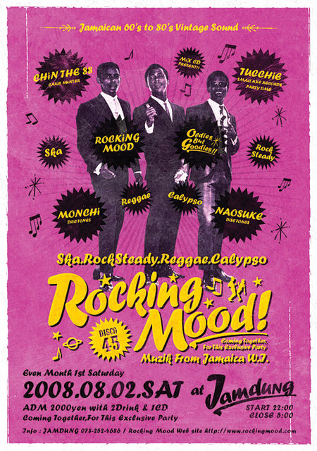 ROCKING MOOD JAMAICAN 60's to 80's SKA.ROCKSTEADY.REGGAE 偶数月第1土曜日開催 2008.08.02.SAT at JAMDUNG START 22:00 CLOSE 5:00 ADM 2000yen with 2Drink + 1CD 今回のROCKING MOODにお越しの全ての方にROCKING MOODによる MIX CD "EVERYTHING GOOD vol.ONE" をプレゼント! 偶数月第1土曜日開催中の60〜80年代にジャマイカで生まれた スカ、ロックステディ、レゲエを中心にセレクトする ROCKING MOOD! 神戸でジャマイカン・オールディーズ(特にスカ!ロックステディ!)を 思う存分に堪能できるのはROCKING MOODで間違いな