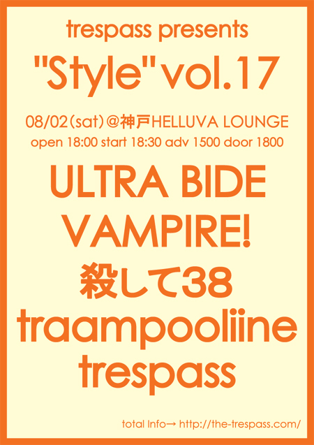 神戸のtrespassです。 本日は自主企画の宣伝をさせて下さい! trespass presents“Style”vol.17 8月2日(土)神戸HELLUVA LOUNGE open18:00 start18:30 adv\1500 door\1800 ●ULTRA BIDE http://macxyz.at.infoseek.co.jp/ ●VAMPIRE! http://purple.ap.teacup.com/vampire/ ●殺して38 http://6630.teacup.com/kghm/bbs ●traampooliine http://ip.tosp.co.jp/i.asp?I=traampooliine ●trespass http://the-trespass.com/ 隔月開催企画の第17弾! 今回は京都を拠点に1979年より、そして今なお精力的に活動を続け