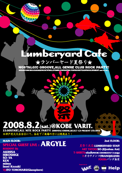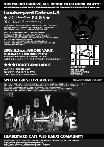 ☆告知☆ 2008/8/2 (SAT.) LUMBERYARD CAFE vol.8 ☆ランバーヤード夏祭り☆ @KOBE VARIT (各線三宮駅,元町駅下車、徒歩7分) 2000yen/1drink ※神戸花火大会当日にて、浴衣でご来場の方には特典あり! 22:00 START/ALL NITE ROCK PARTY ※先着40名様にRESIDENT DJs select CD present!!! TICKET VARIT.店頭 078-392-6655 電子チケットぴあ 0570-02-9999 ローソンチケット 0570-063-0005 "LUMBERYARD CAFE"は、2006年11月に北野der Kitenで始動し、 今や、神戸を代表するオールジャンルのロックパーティーへと成