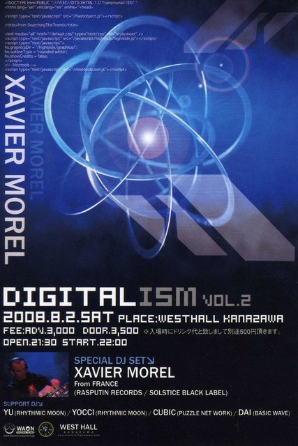 DIGITALISM vol.2 2008.08.02sat OPEN/START:22:00 SPECIAL DJ SET XAVIER MOREL (RASPUTIN RECORDS/SOLSTICE BLACK LABEL/FRA) DJ’s CUBIC (PUZZLE NETWORK) YU (Rhythmic Moon) YOCCI (Rhythmic Moon) DAI (BASIC WAVE) and more... Profile XAVIER MOREL (RASPUTIN RECORDS/SOLSTICE BLACK LABEL/FRA) 1976年フランス生まれ。80年代前半のエレクトロニック・ボディミュージックに 影響うを受